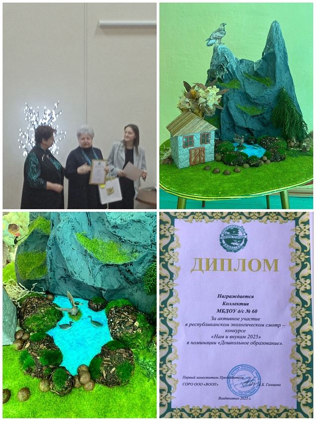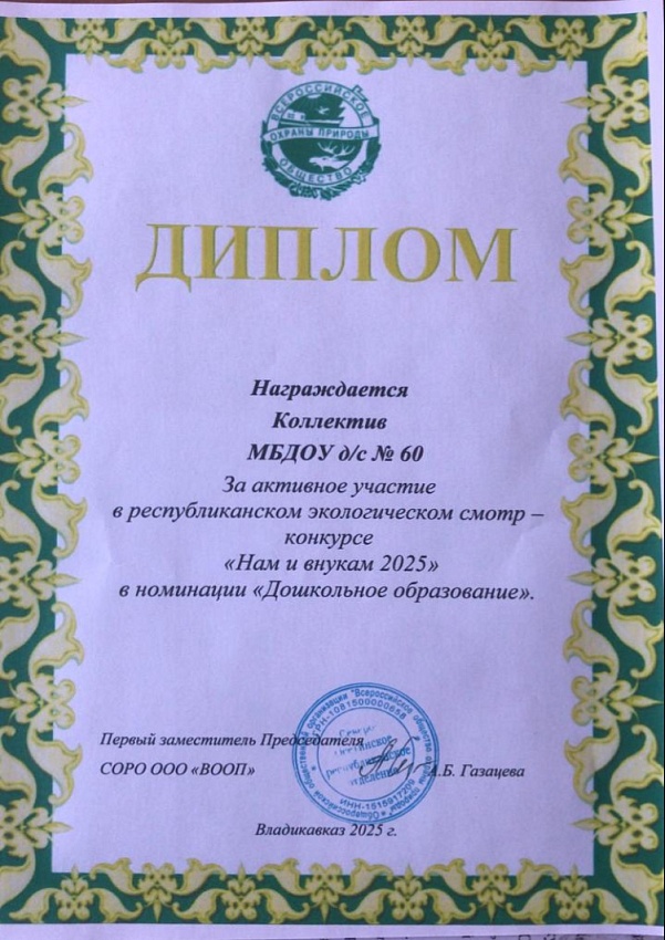 По итогам ежегодного Республиканского экологического смотра — конкурса «Нам и внукам 2025», Коллектив ДОУ награжден диплом.